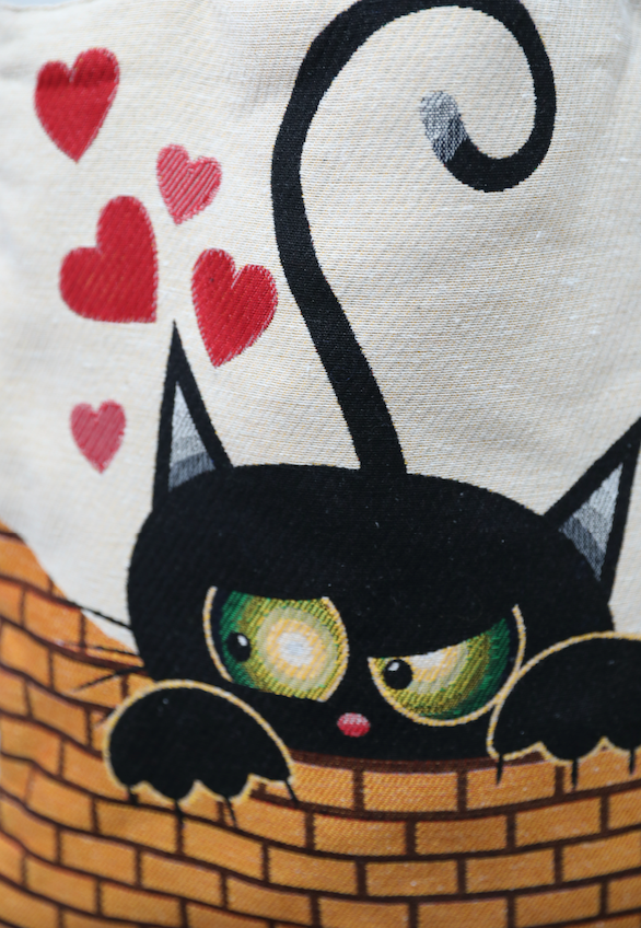 The bag is from our new stock, made in Turkey and 100% cotton. Such a cute cat design like, you are carrying a cat. Take your cat to wherever you go! Perfect bag for daily life usage! It is also washable you can use it for a long time.