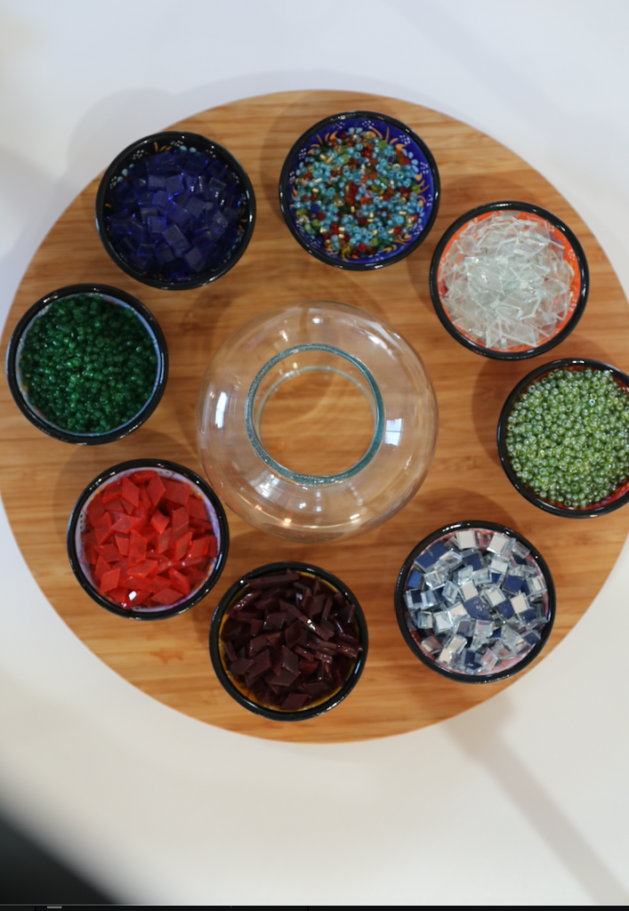 The mosaics of the lamp are made with glass beads that are joined by plaster. the plaster gives a great strength to the glass globe. The design of coloured mosaics creates a variety of reflections when the lamp is turned on, which is incredible.